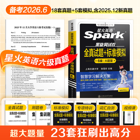 备考2026.6星火英语六级考试真题试卷四级,含12月纸质真题,23套试卷+62篇专项+1450词汇+高分突破+app在线刷题,额外赠送PDF版晨读美文【赠新华文轩实物考点(核心考点+20篇翻译)】