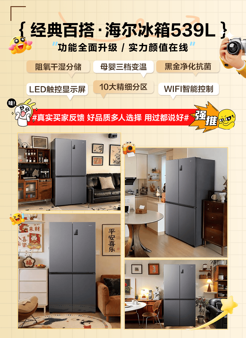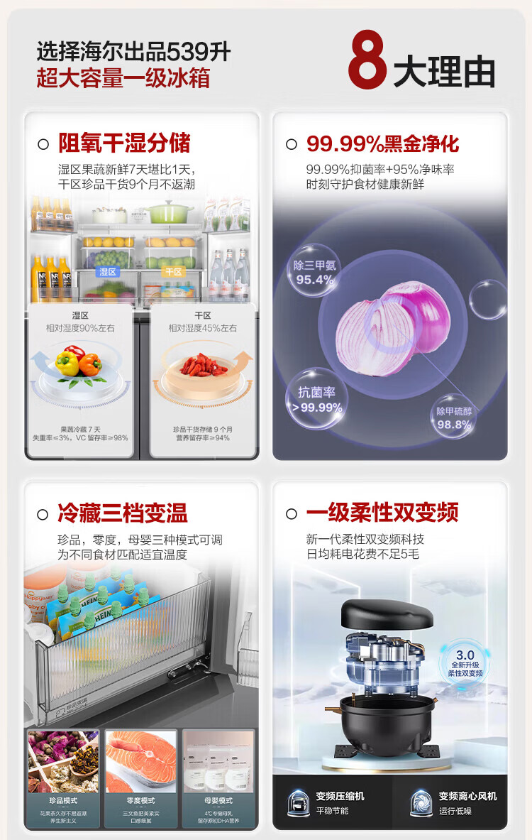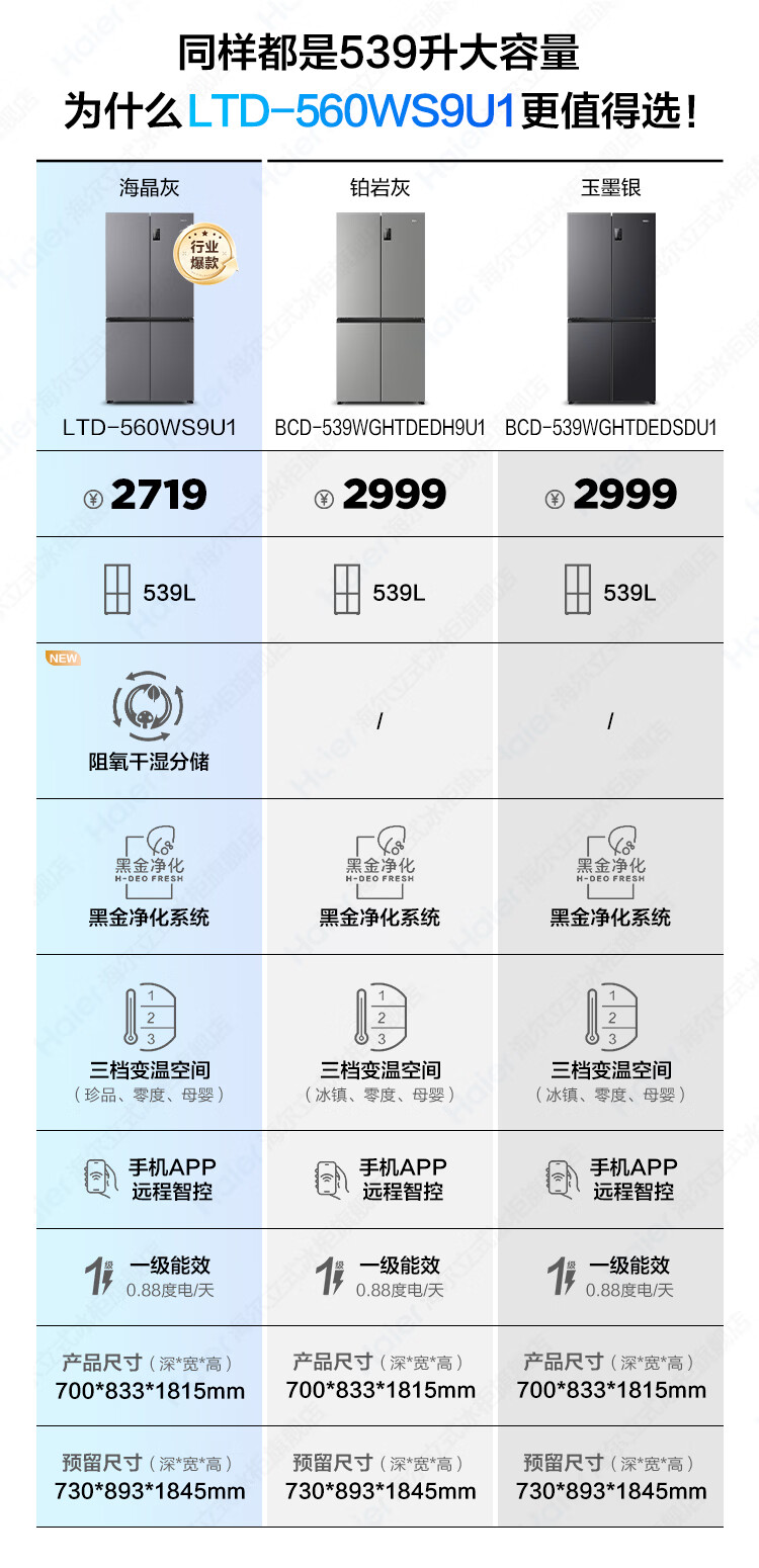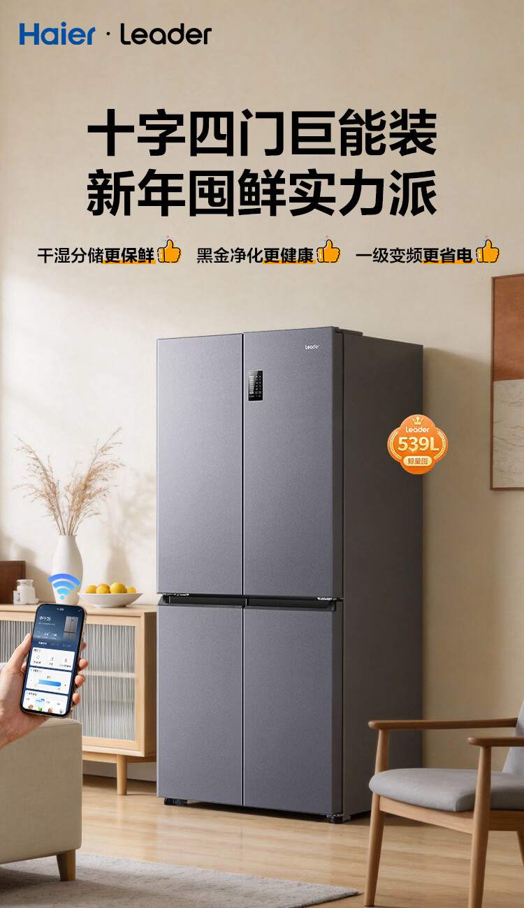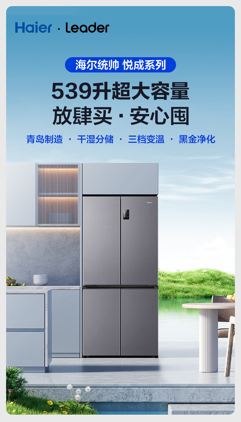 海尔(Haier)冰箱出品539升四开门十字对开门双开统帅560大容量风冷无霜新一级能效变频Leader电冰箱 家电补贴 539升+阻氧干湿分储+黑金净化+一级节能