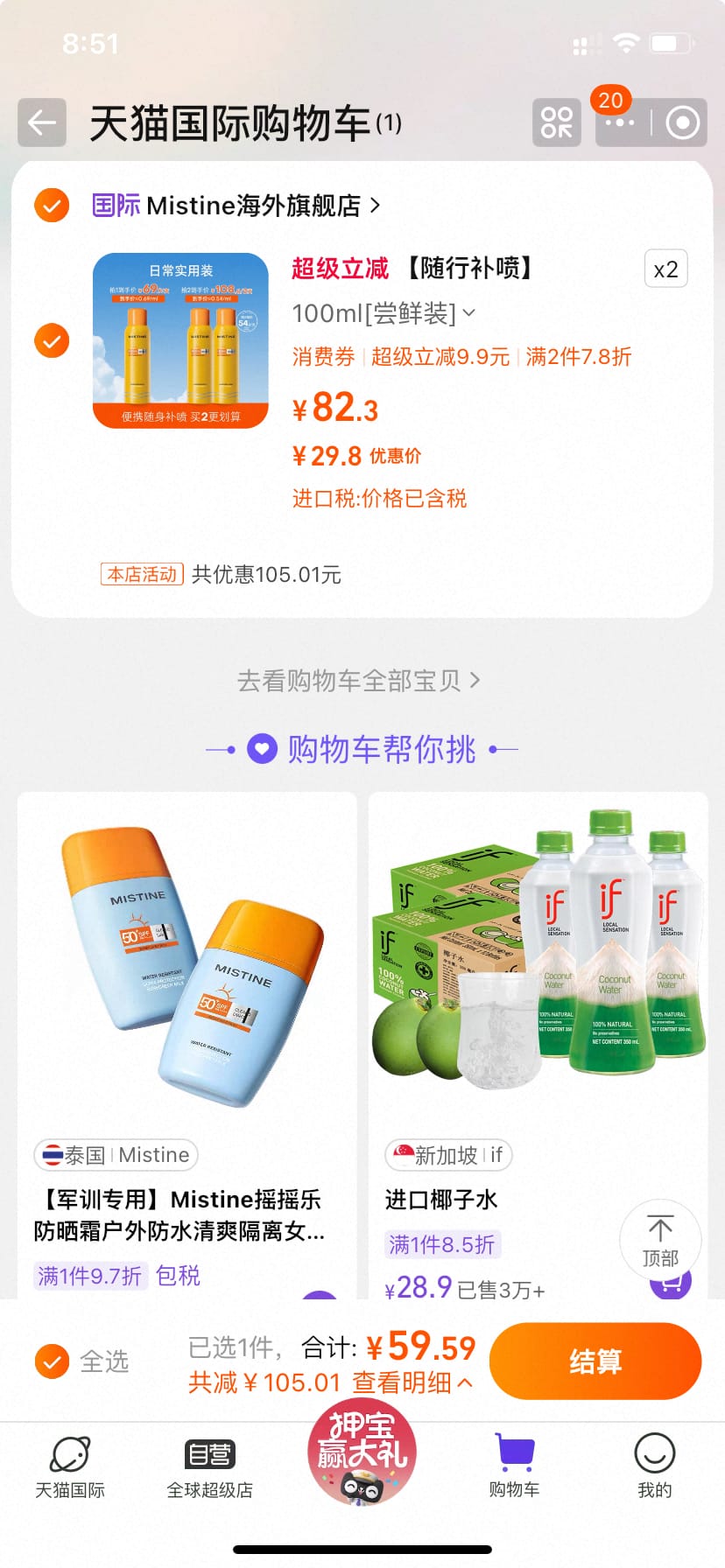 军训防晒 Mistine蜜丝婷防晒喷雾 拍2件 折29.8
